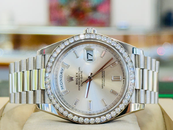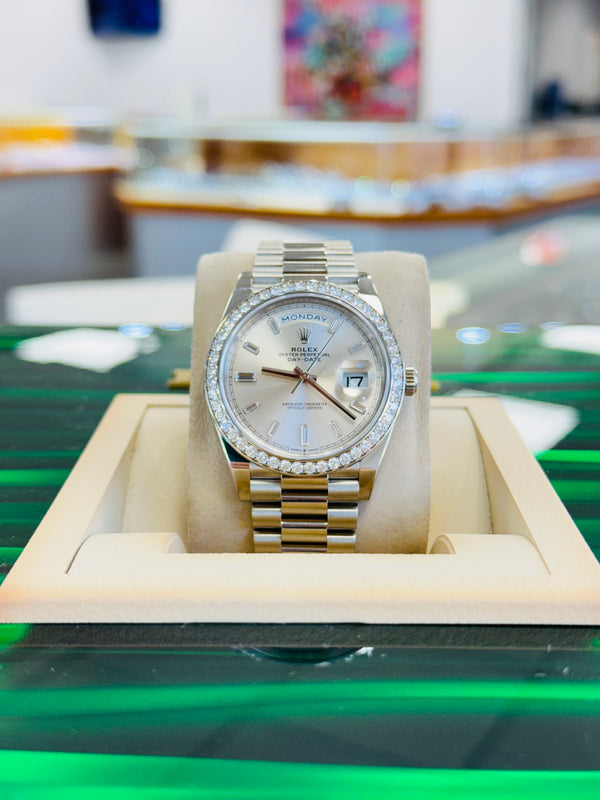 Rolex Day-Date 40 228349RBR President White Gold Factory Silver Baguette Diamond Dial & Diamond Bezel MINT