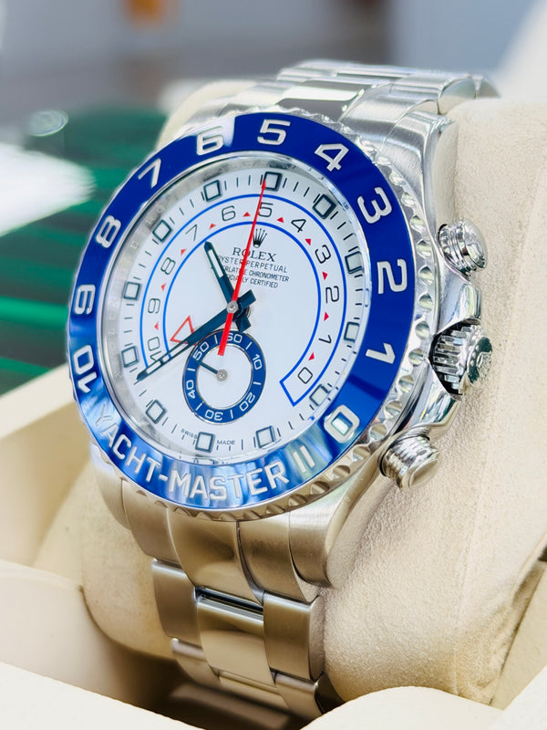 Rolex Yacht-Master II 44 116680 Stainless Steel White Dial Blue Hands Blue Ceramic Bezel Regatta Timer Box and Papers PreOwned