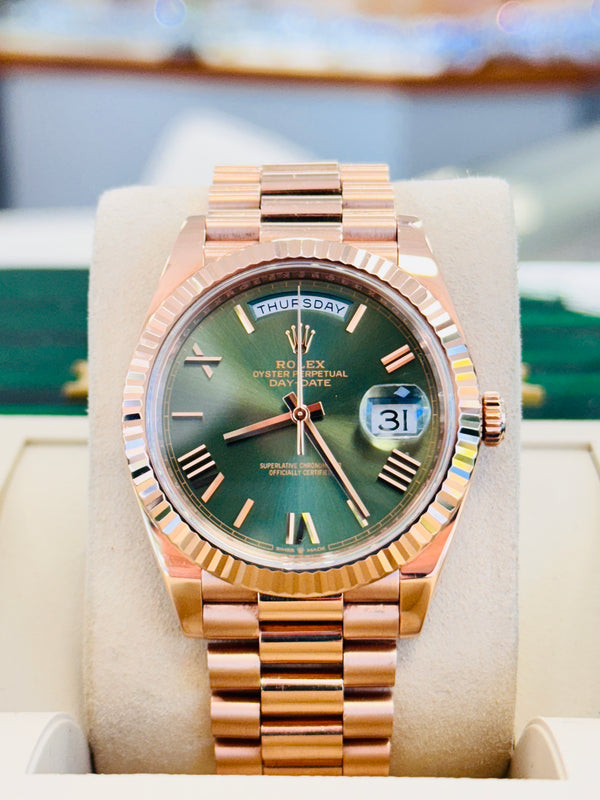 Rolex Day-Date 40 228235 Olive Green President Rose Gold PreOwned